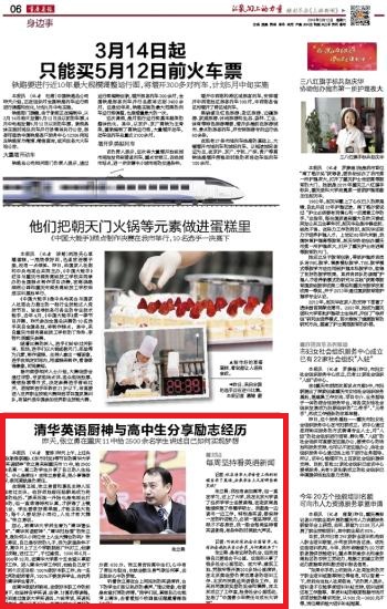 听着张立勇在台上用流利的英语演讲,台下的学生们报以热烈的掌声。“难以想象,他曾是食堂打菜的师傅。”同学们说,真想自己也能考上清华,去看看那个校园里还潜藏着哪些“大侠”。