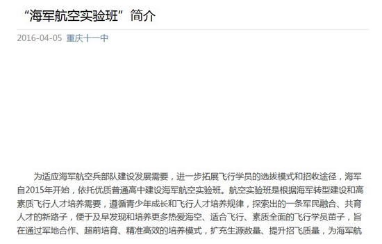 为适应海军航空兵部队建设发展需要,进一步拓展飞行学员的选拔模式和招收途径,海军自2015年开始,依托优质普通高中建设海军航空实验班。航空实验班是根据海军转型建设和高素质飞行人才培养需要,遵循青少年成长和飞行人才培养规律,探索出的一条军民融合、共育人才的新路子,便于及早发现和培养更多热爱海空、适合飞行、素质全面的飞行学员苗子,旨在通过军地合作、超前培育、精准高效的培养模式,扩充生源数量、提升招飞质量,为海军航空兵战斗力建设发展提供有力的人才支撑。