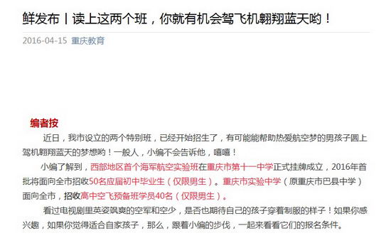 小编了解到,西部地区首个海军航空实验班在重庆市第十一中学正式挂牌成立,2016年首批将面向全市招收50名应届初中毕业生(仅限男生)。重庆市实验中学(原重庆市巴县中学)面向全市,招收高中空飞预备班学员40名(仅限男生)。