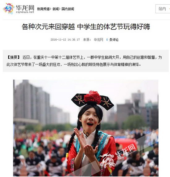 华龙网11月12日14时10分讯(张华)你还记得中学时代的运动会怎么入场的吗?是不是踢着端端正正的正步、喊着千篇一律的口号正儿八经地走入操场?近日,在重庆十一中第十二届体艺节上,一群中学生脑洞大开,用自己的创意和智慧,为此次体艺节带来了一场盛大的狂欢、一场别出心裁的班级特色展示与体育精神的演绎。