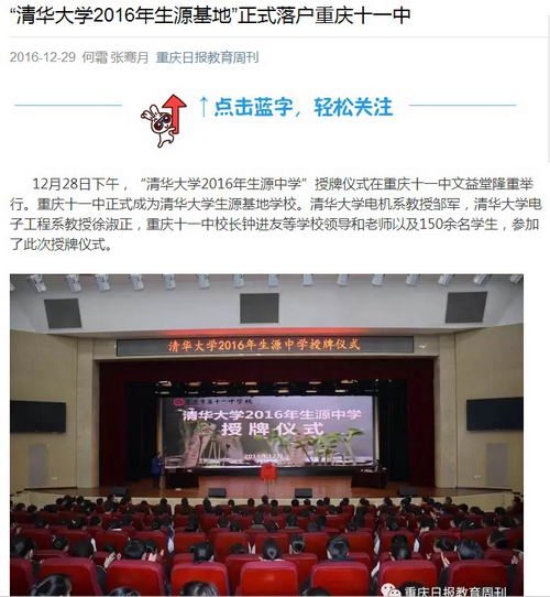 [重庆日报教育周刊] “清华大学2016年生源基地”正式落户重庆十一中