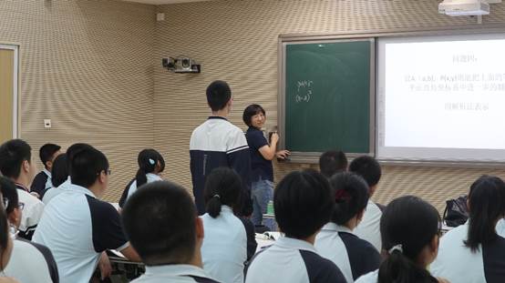 高二年级刘爱莲老师主讲《圆的标准方程》。课程从历史开始、以哲学结尾,整个课程通过一系列问题如“一根细绳如何画出一个圆”、“能给圆下一个定义吗”、“翻译成数学语言”、“上面的等式在坐标系中进一步翻译是”等串联,逻辑清晰,环节紧凑。课程中,刘爱莲老师多次和学生互动、请学生分享自己对问题的解答,同时在学生自主完成例习题环节,多次走进学生中间观察学生完成情况。