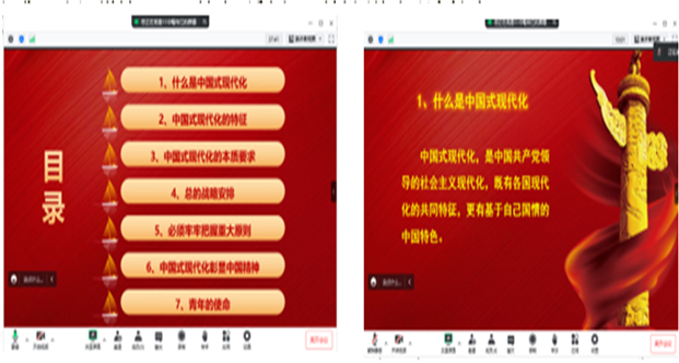 随后,喻老师分享了自己在课堂上宣讲的二十大报告系列之“中国式现代化”。喻老师从“什么是中国式现代化”、“中国式现代化的特征”、“中国式现代化的本质要求”、“总的战略安排”、“必须牢牢把握重大原则”、“中国式现代化彰显中国精神”、“青年的使命”等方面作了细致分享。