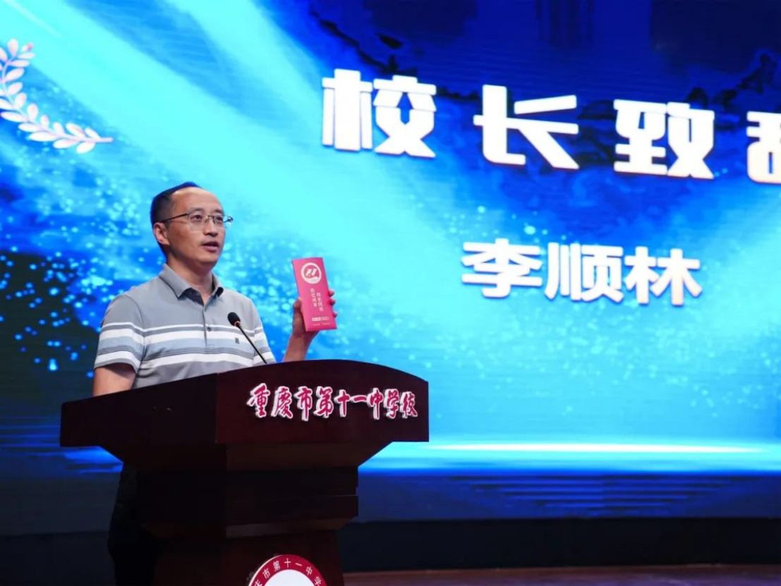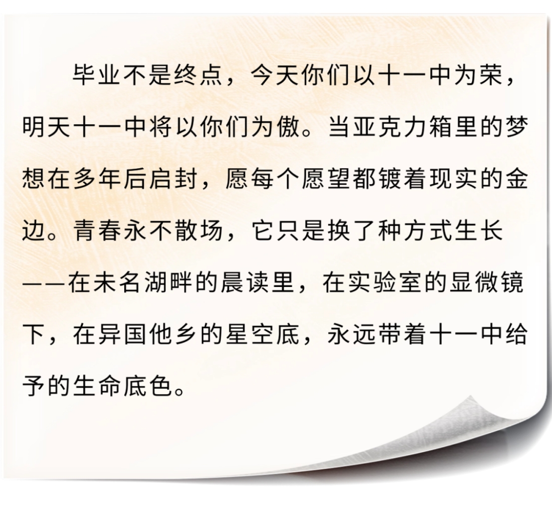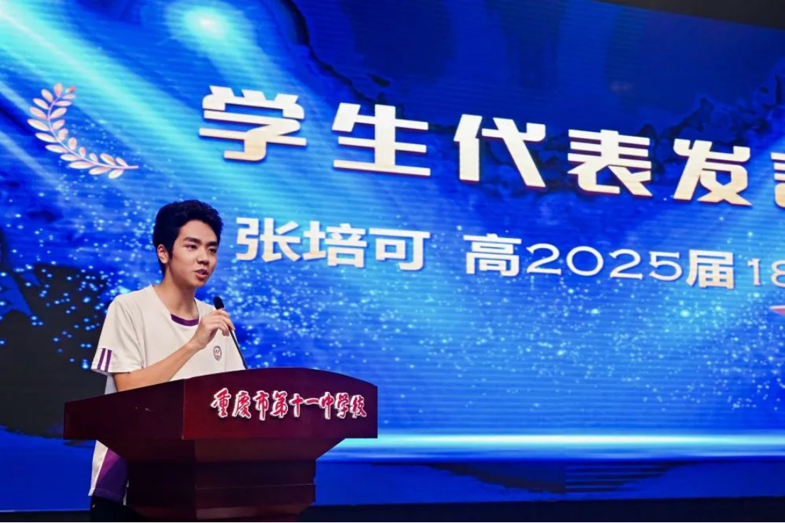 典礼上,学生代表高2025届18班张培可发言说到“无论走到哪里,我们都是十一中人,请带着精益求精的信念,带着老师们教给我们的踏实和坚韧,带着三年同窗的情谊和力量一路前行”时,台下响起阵阵掌声。